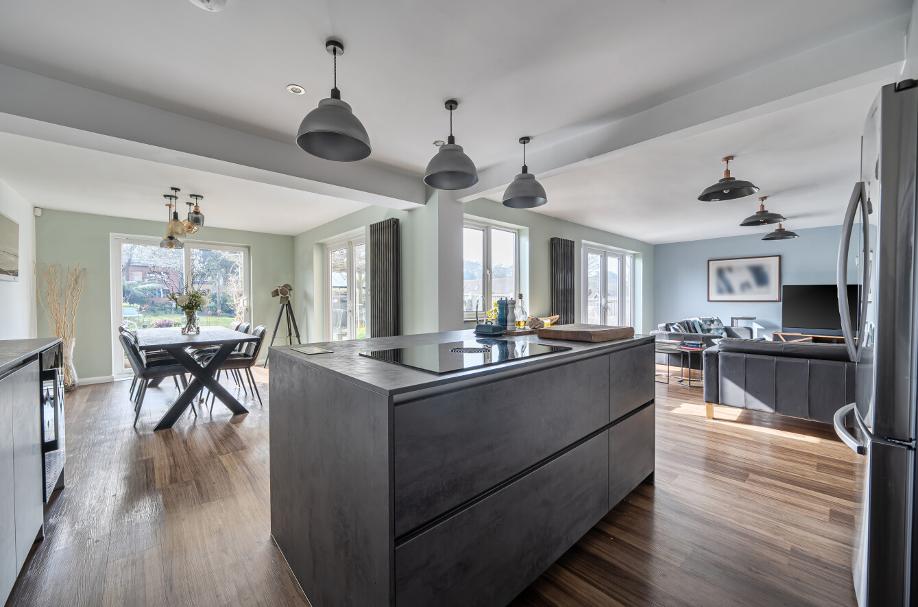 The first floor continues to impress with four double bedrooms. Two well-appointed bedrooms provide versatility and comfort for family and guests, with bedroom two displaying a luxury en-suite bathroom. The principal bedroom suite enjoys a luxury bathroom for added comfort and convenience. A family bathroom serves the remaining bedrooms. Large windows flood the interiors with natural light, illuminating the sleek design elements, whilst every detail has been carefully considered, from the fixtures to the premium flooring materials.