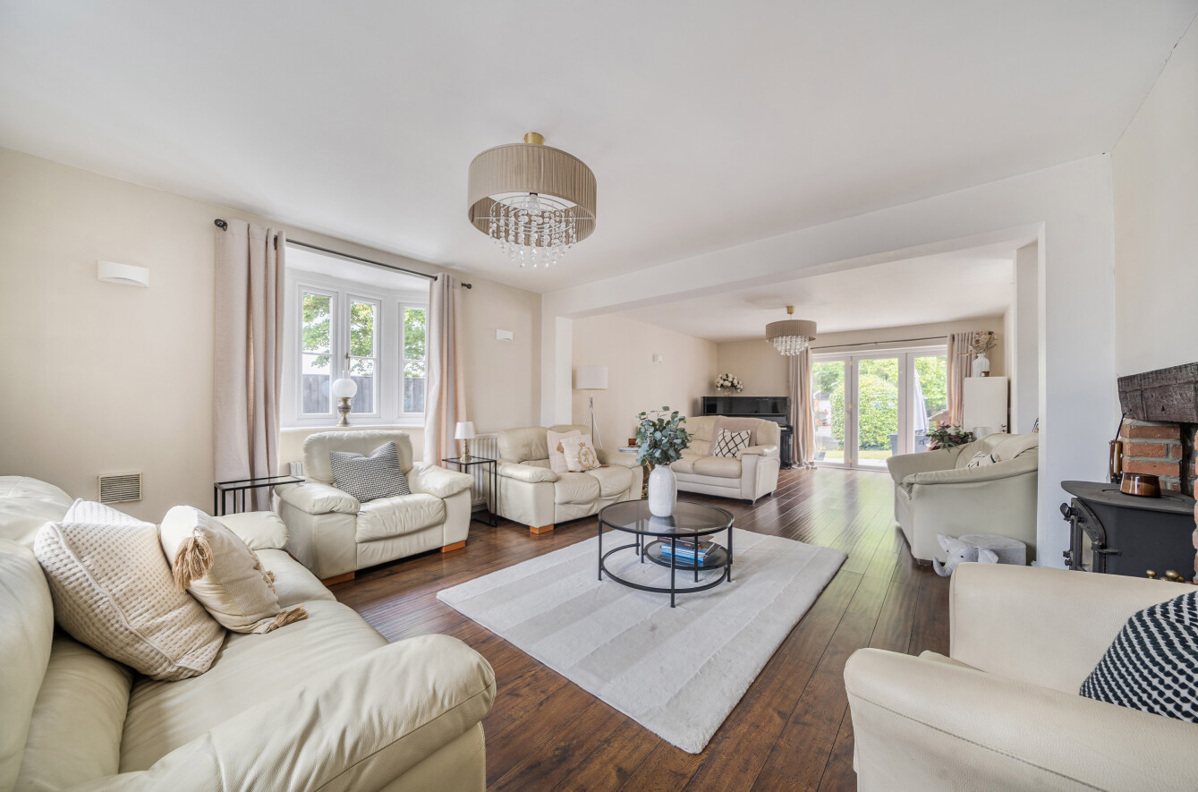 To the rear, a stunning full-width kitchen/dining/family room forms the heart of the home, featuring contemporary fittings and ample space for both everyday living and entertaining, with direct access onto the rear patio terrace.