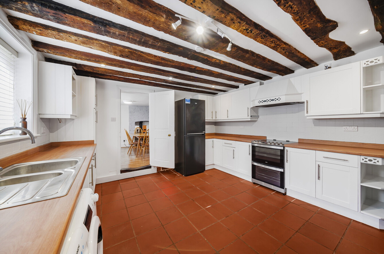 On the first floor there is a large principal bedroom, again with original beams, built in storage and en-suite shower room. The second bedroom is a large single with built in storage and views out over the garden.